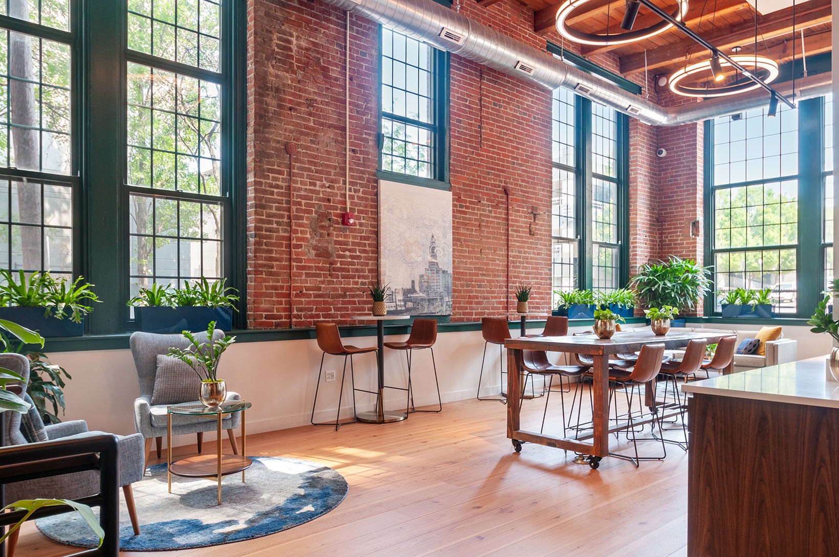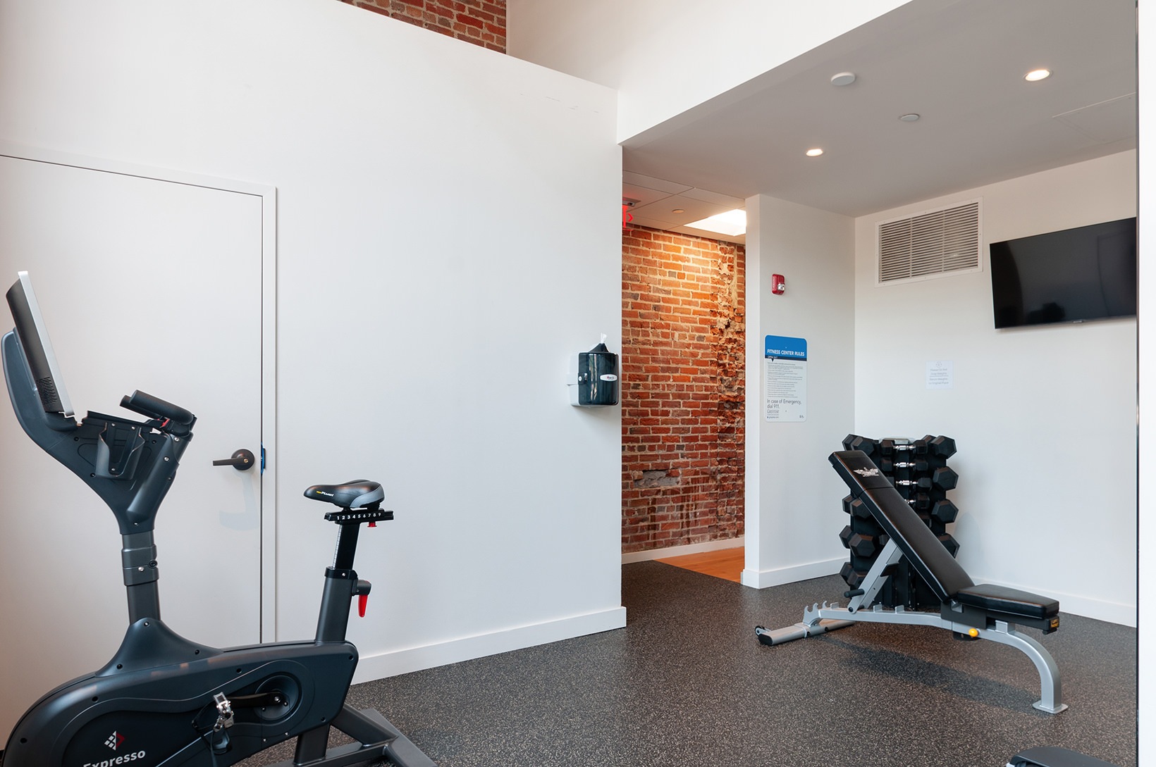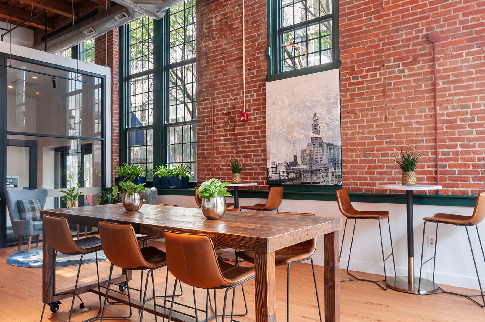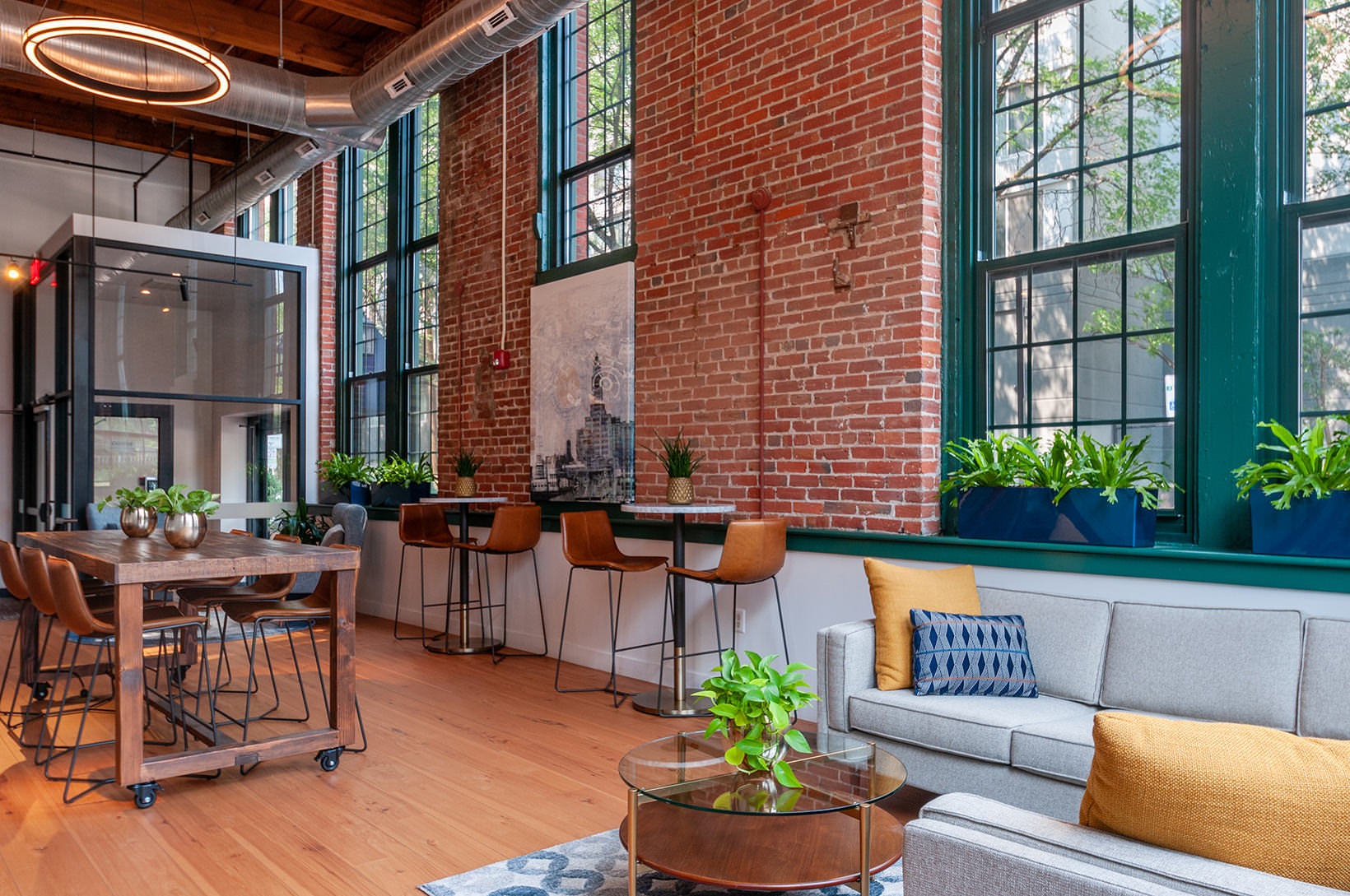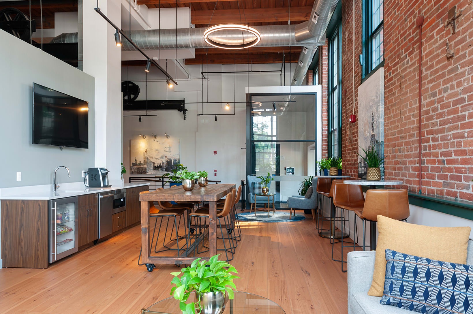 spacious clubhouse kitchen with brick walls and large, tall windows colorful mural on lobby wall next to concierge counter bright and colorful lobby six chair dining table in clubhouse kitchen seating areas near bright windows in clubhouse kitchen clubhouse kitchen with sitting and eating areas well lit clubhouse kitchen with coffee station, snacks and drinks cardio machines next to large windows in fitness center free weights in fitness center exterior shot of Logan Lofts awning covered entrance to Logan Lofts The Lofts at Logan View